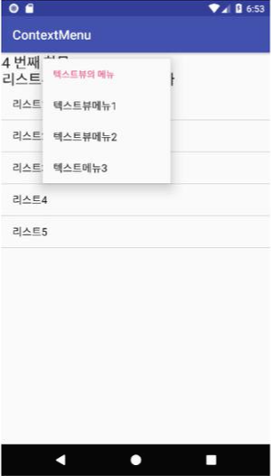 - registerForContext: Context Menu를 등록하는 메서드로, 메서드의 매개 변수로 넣어준 View 객체에 메뉴가 설정됩니다.
