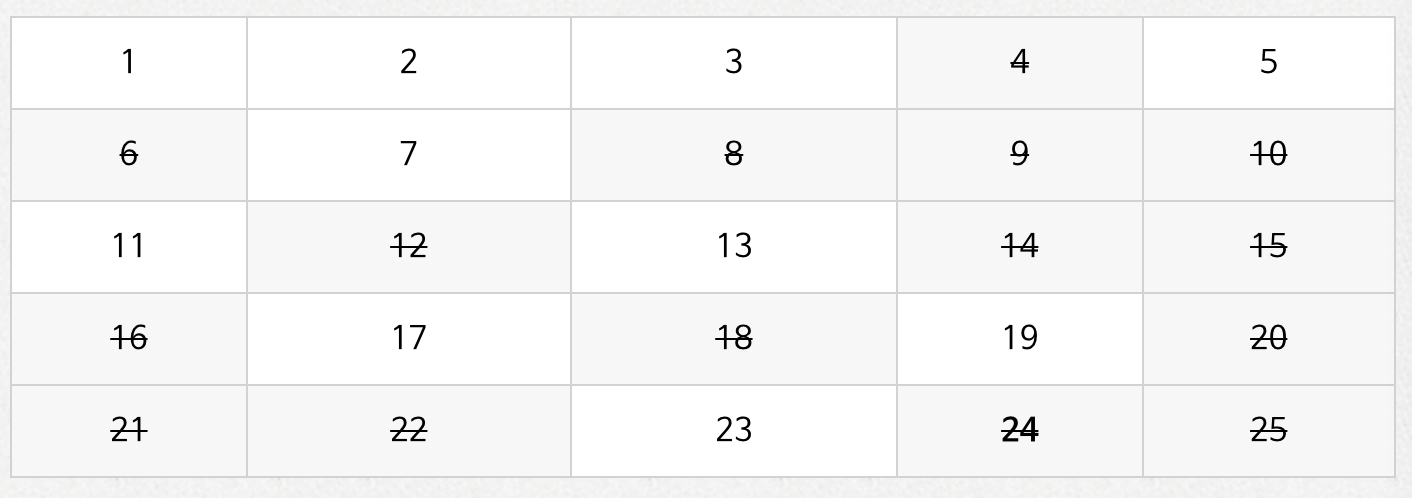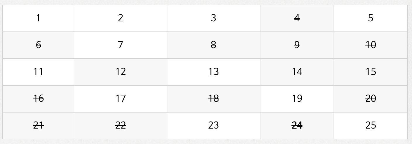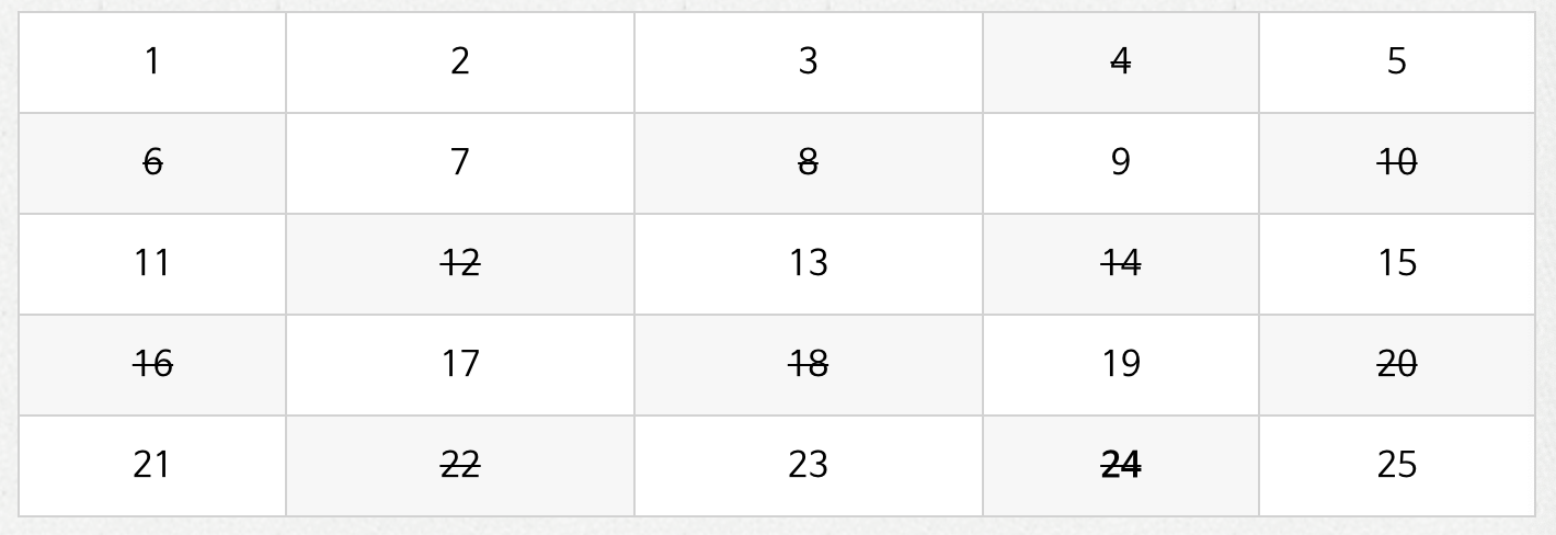 2) 2부터 시작하여 특정 숫자의 배수에 해당하는 숫자들을 모두 지웁니다. 이때, 자기 자신은 건너뜁니다.