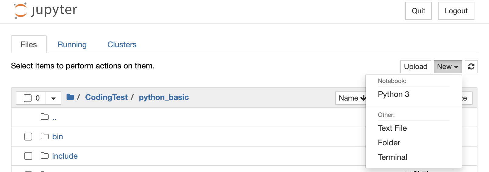주피터 노트북 상에서 파일을 생성하고 싶다면, 우측 New 버튼을 눌러서 원하는 파일 형식을 선택해줍니다.
