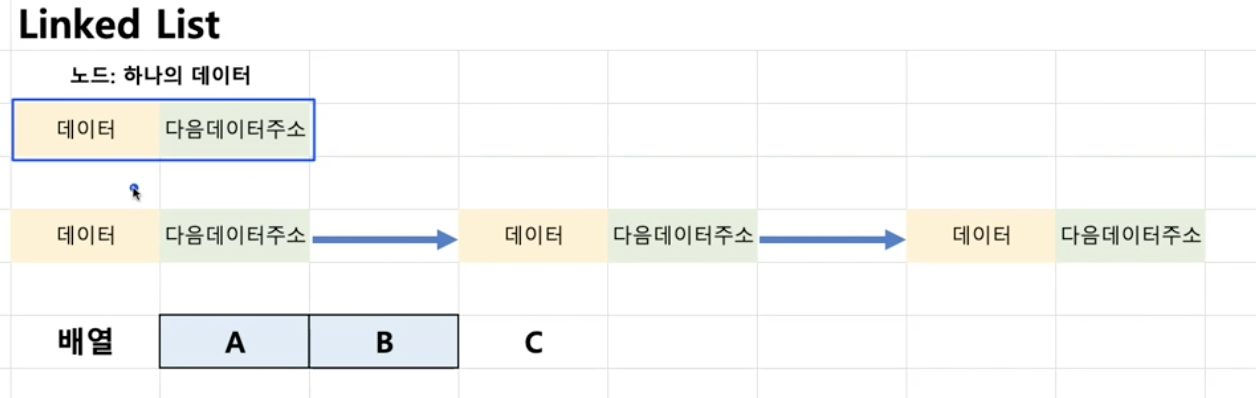-배열은 순차적으로 연결된 공간에 데이터를 나열하는 데이터 구조인데, 링크드 리스트는 떨어진 곳에 존재하는 데이터를 화살표로 연결해서 관리하는 데이터 구조이다