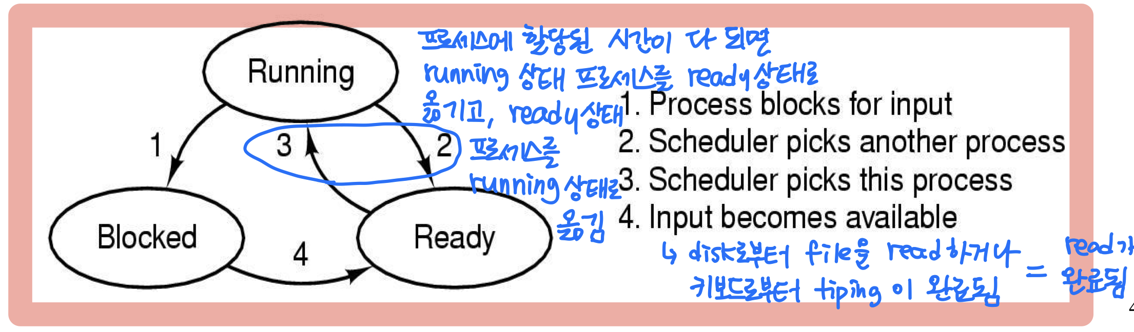 - Blocked : I/O 요구가 있을 때(read or the character typed) 외부 이벤트 발생 전까지 실행을 할 수 없는 상태