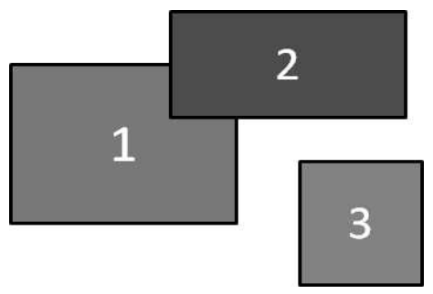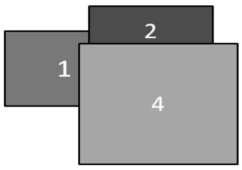 여기에 그림-2에서 보인 것처럼 4번 색종이가 하나 더 놓이면 3번 색종이는 완전히 가려서 보이지 않게 된다. 그리고, 1번 색종이와 2번 색종이는 부분적으로 가려 보이며, 4번 색종이는 완전히 보이게 된다.