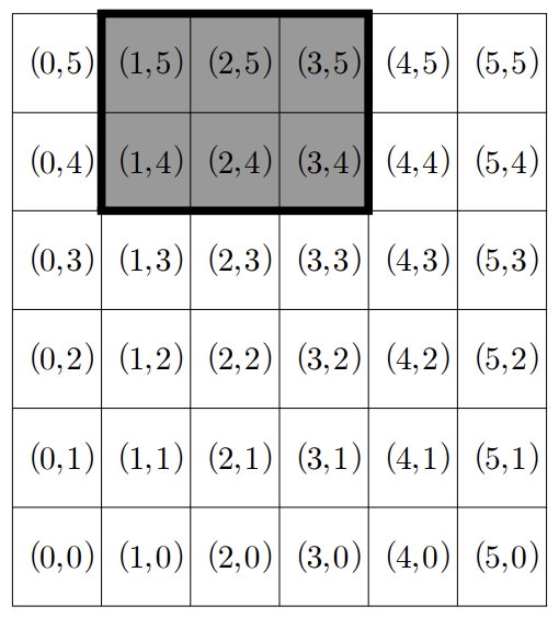 편의상 가로 6칸, 세로 6칸으로 이루어진 격자의 예를 들어 설명하면, 각 칸에 표시된 값 (a,b)는 해당 칸의 번호를 나타낸다. 가장 왼쪽 아래의 칸은 (0,0) 가장 오른 쪽 위의 칸은 (5,5)이다.