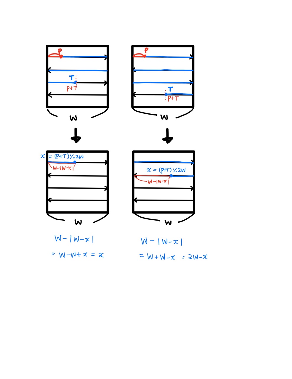 가로와 세로를 각각 확인해주면 가로는 오른쪽과 왼쪽, 세로는 위쪽과 아래쪽을 왕복한다는 것을 알 수 있습니다. 따라서 현재 위치에서 T를 더하고 각 길이의 2배한 값으로 모듈러 연산을 해주면 줄어든 좌표를 구할 수 있습니다.