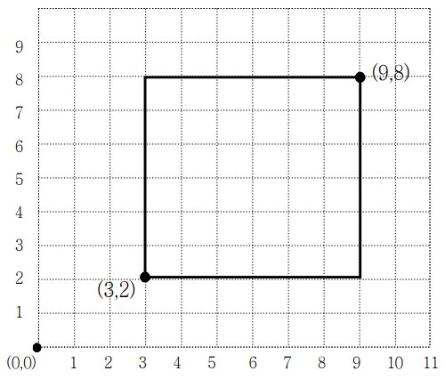 2차원 격자공간에 두 개의 꼭짓점 좌표로 표현되는 직사각형이 있다. 직사각형은 아래와 같이 왼쪽 아래 꼭짓점 좌표 (x, y)와 오른쪽 위 꼭짓점 좌표 (p, q)로 주어진다.