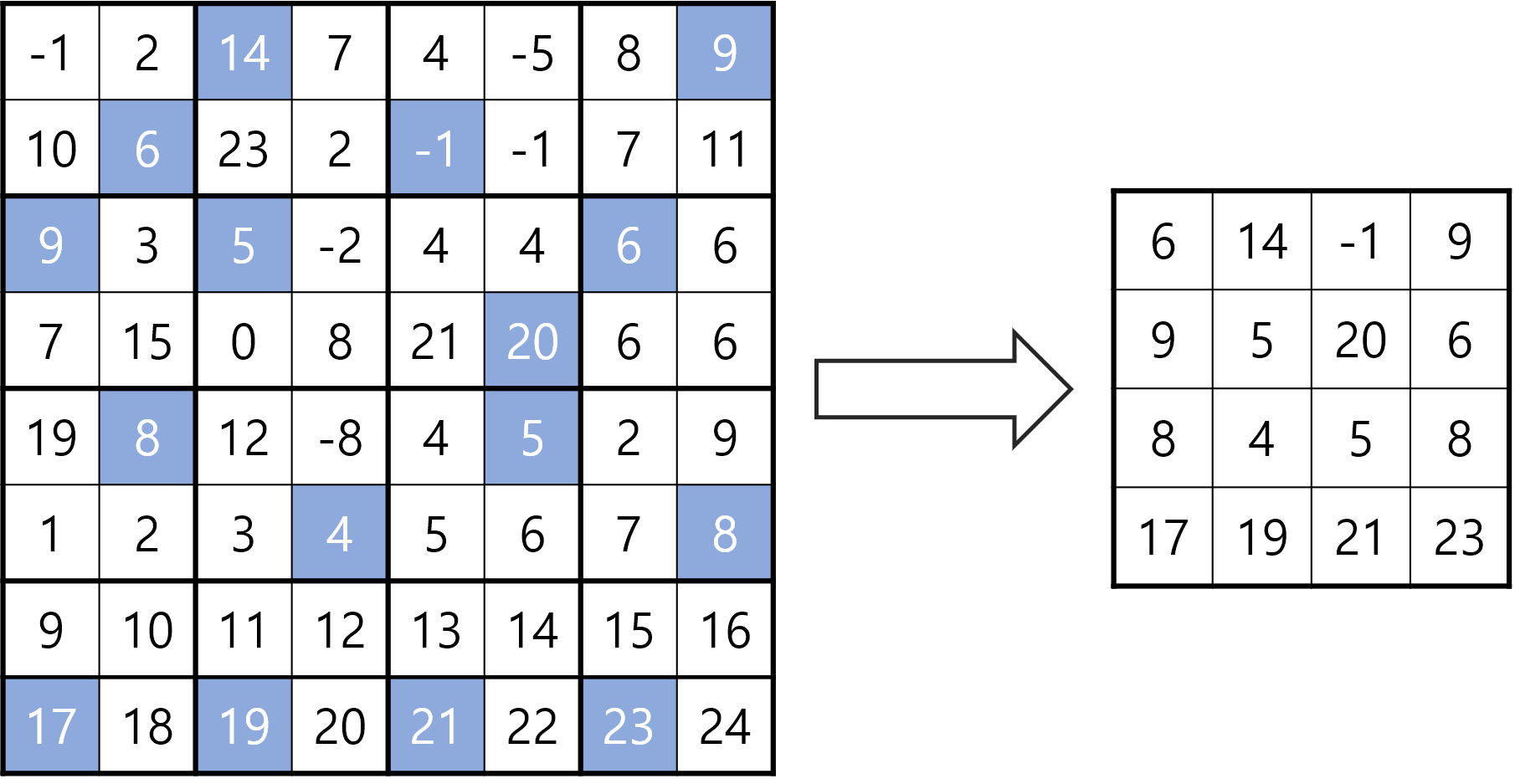 다음은 8×8 행렬이 주어졌다고 가정했을 때 222-풀링을 1회 적용하는 과정을 설명한 것이다