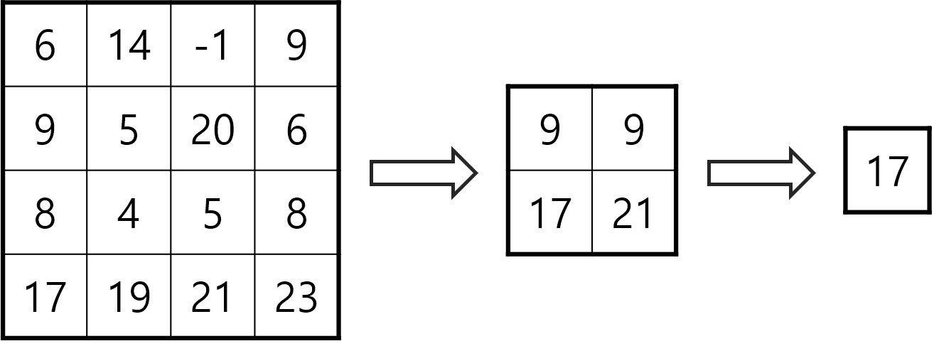 - 각 정사각형에서 2번째로 큰 수만 남긴다. 여기서 2번째로 큰 수란, 정사각형의 네 원소를 크기순으로 a4 ≤ a3 ≤ a2 ≤ a1 라 했을 때, 원소 a2를 뜻한다.