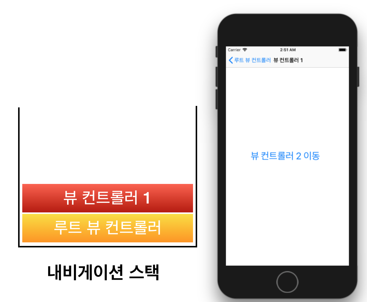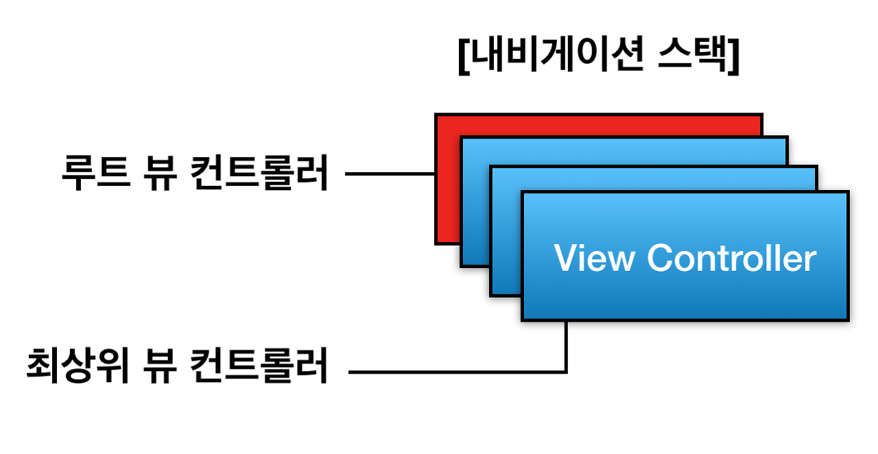 -루트 뷰 컨트롤러: 내비게이션 스택에 가장 하위에 있는 뷰 컨트롤러로, 가장 먼저 스택에 추가된 뷰 컨트롤러입니다. 내비게이션 스택에서 pop되지 않습니다.