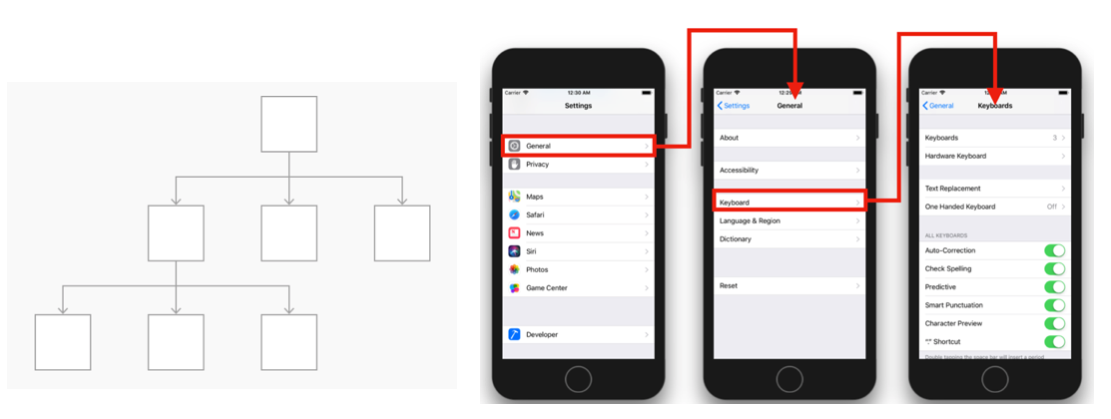 -계층적 구조의 화면 전환을 위해 사용되는 드릴 다운 인터페이스(drill-down interface) 입니다.