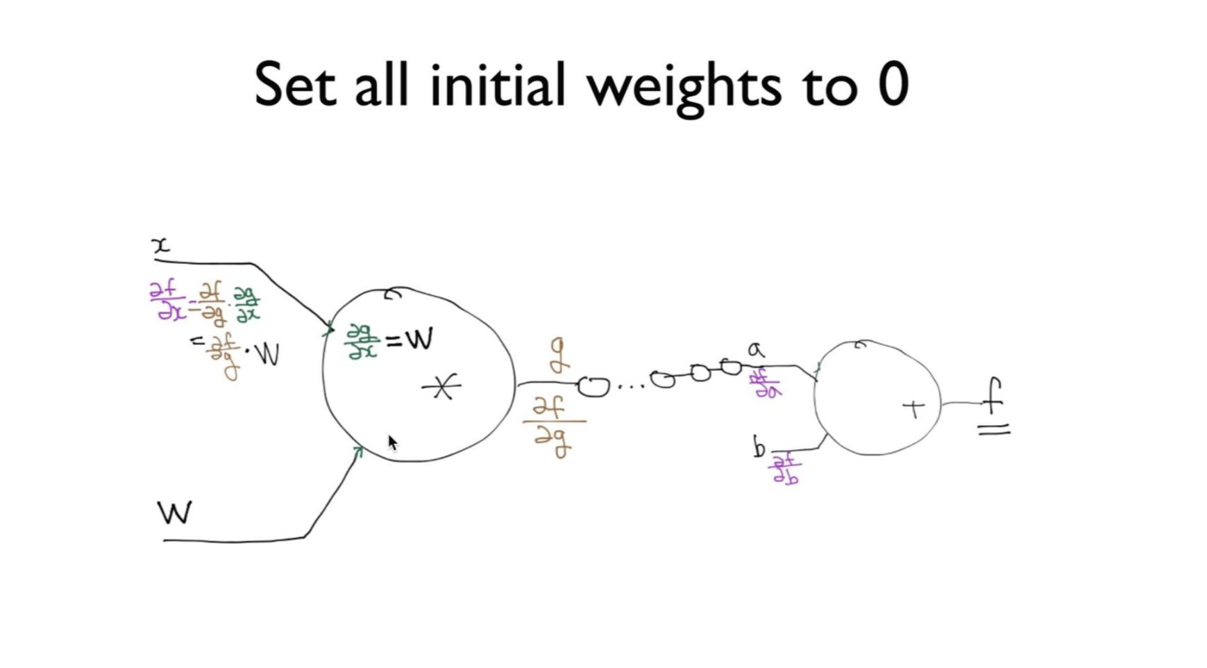w 값을 0으로 설정하면 미분값도 0이 되므로 gradient 값이 사라지게 됩니다. 그러므로 w 값을 0으로 설정하면 안 된다는 것을 알 수 있습니다.