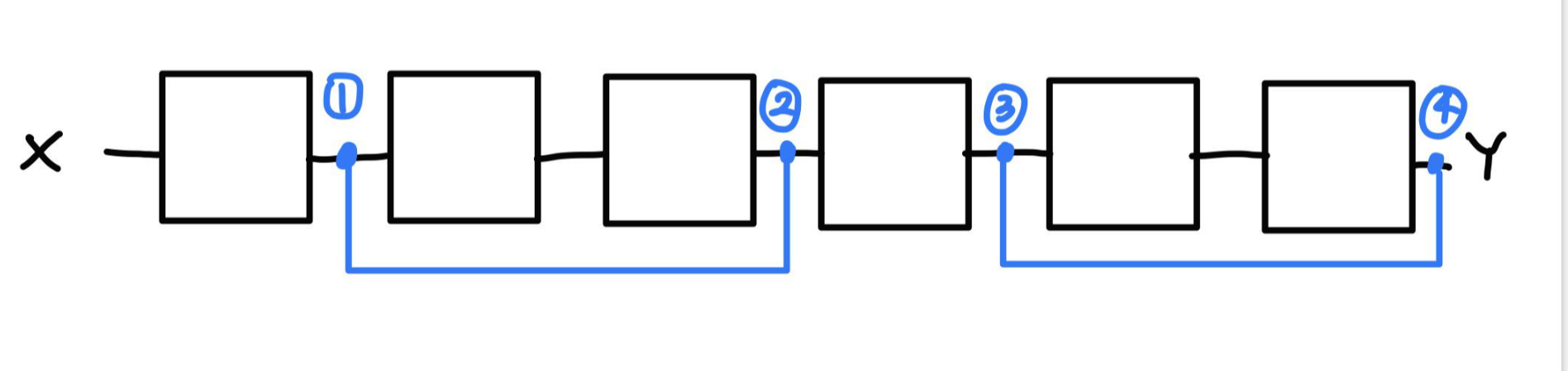 1번의 출력을 두 layer 앞인 2번에 연결합니다. 또한 3번의 출력을 두 layer 앞인 4번에 연결합니다.