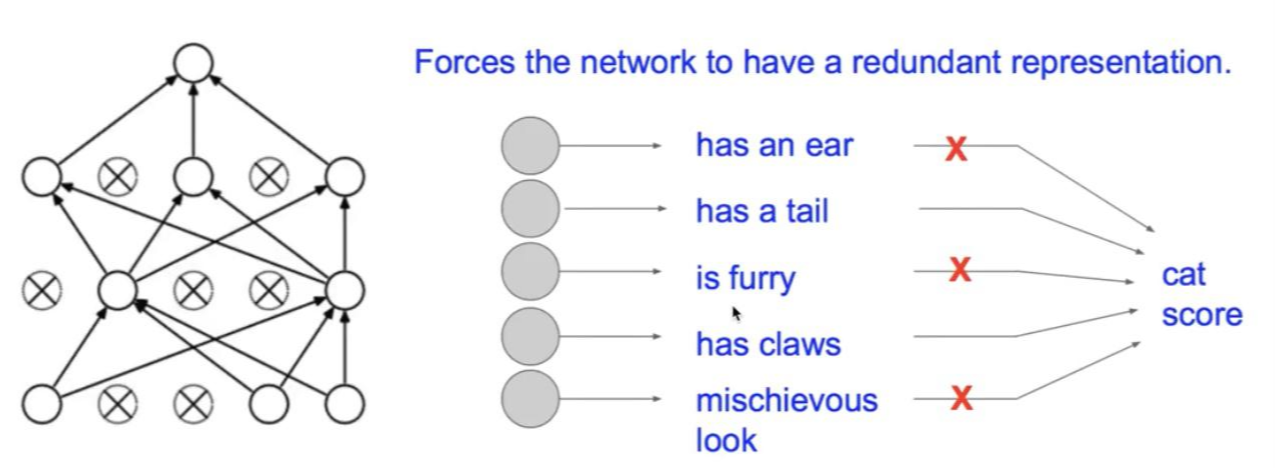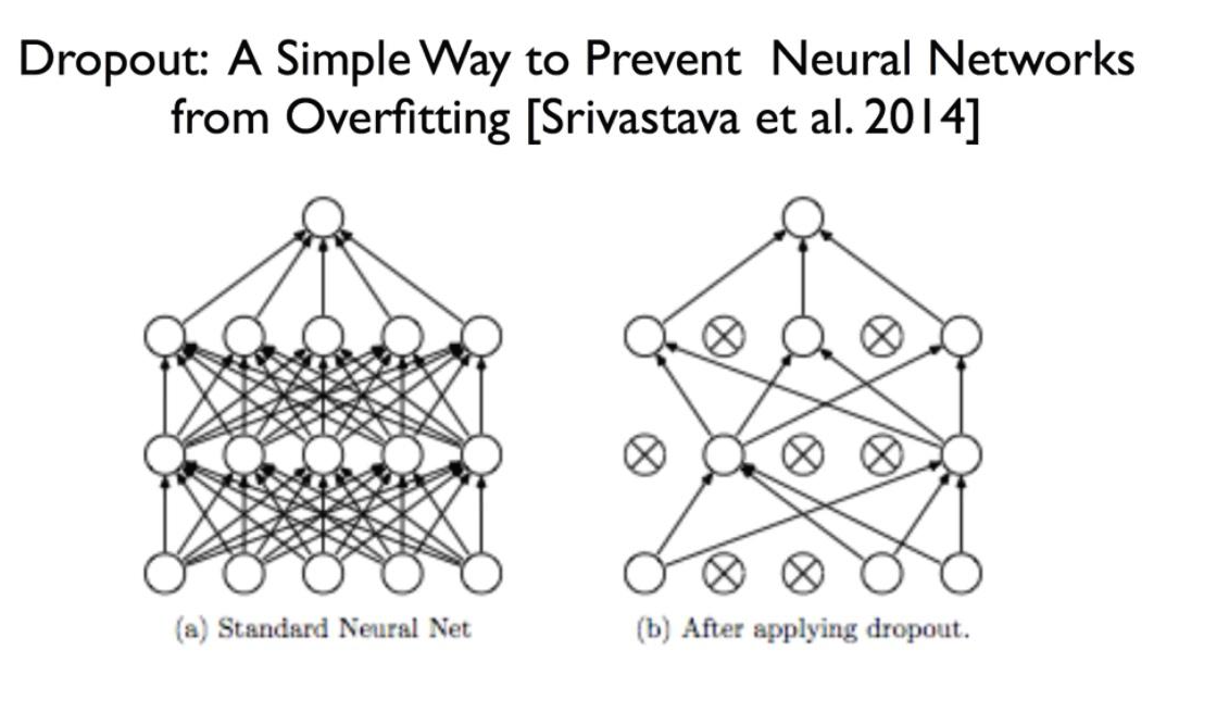 몇 개의 노드의 연결을 끊어버리는 것으로, 일부 노드들은 쉬게 한 다음 나머지 노드들을 이용해서 학습을 합니다. 그리고 마지막에 학습한 것들을 총동원해서 예측을 하는 방식입니다.