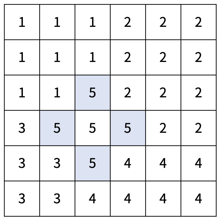 재현시는 크기가 N×N인 격자로 나타낼 수 있다. 격자의 각 칸은 구역을 의미하고, r행 c열에 있는 구역은 (r, c)로 나타낼 수 있다. 구역을 다섯 개의 선거구로 나눠야 하고, 각 구역은 다섯 선거구 중 하나에 포함되어야 한다. 선거구는 구역을 적어도 하나 포함해야 하고, 한 선거구에 포함되어 있는 구역은 모두 연결되어 있어야 한다. 구역 A에서 인접한 구역을 통해서 구역 B로 갈 수 있을 때, 두 구역은 연결되어 있다고 한다. 중간에 통하는 인접한 구역은 0개 이상이어야 하고, 모두 같은 선거구에 포함된 구역이어야 한다.