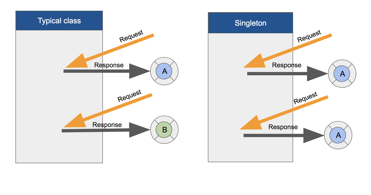 특정 클래스의 인스턴스가 오직 하나임을 보장하는 객체를 의미합니다. 애플리케이션이 요청한 횟수와는 관계없이 이미 생성된 같은 인스턴스를 반환합니다. 즉, 애플리케이션 내에서 특정 클래스의 인스턴스가 딱 하나만 있기 때문에 다른 인스턴스들이 공유해서 사용할 수 있습니다.