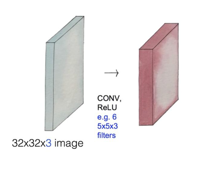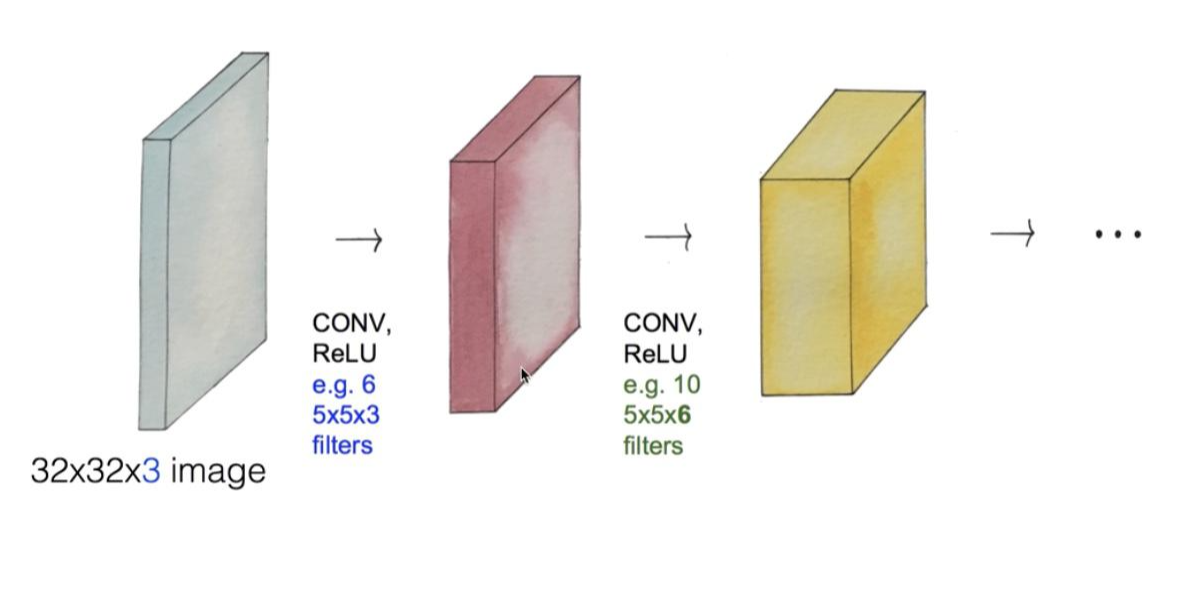 그림1. Activation Map: 앞의 과정을 여러 번 할 수 있습니다. CONV과 ReLU를 동시에 사용해서 적용할 경우 6개의 필터를 사용하므로 깊이가 6이 됩니다.