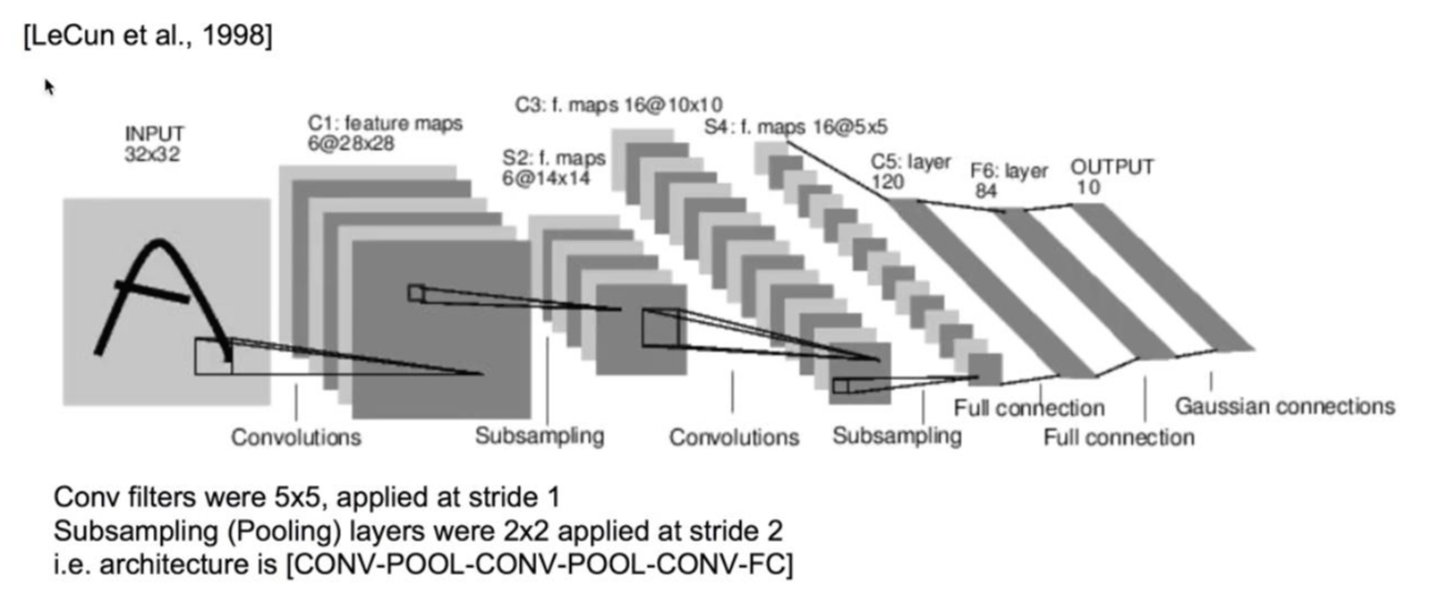 처음 Convolutions 과정에서 6개의 이미지를 만들어내고, 각각의 이미지를 Subsampling합니다. 해당 과정을 여러 번 반복하는 과정을 통해 output을 산출해냅니다.