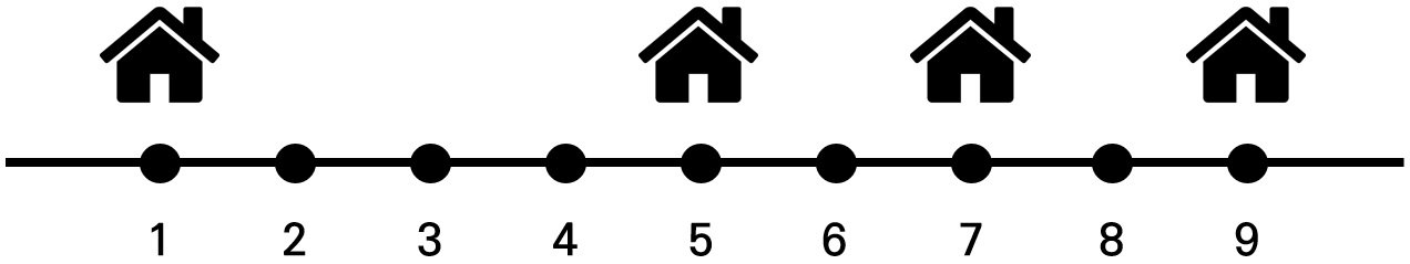 이 경우 5의 위치에 설치했을 때, 안테나로부터 모든 집까지의 거리의 총 합이 (4+0+2+4)=10으로, 최소가 된다.