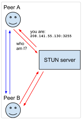 STUN(단축어 안의 단축어)은 public address(공개 주소)를 발견하거나 peer 간의 직접 연결을 막는 등의 라우터 제한을 결정하는 프로토콜입니다. 클라이언트는 인터넷을 통해 클라이언트의 공개 주소와 라우터의 NAT 뒤에 있는 클라이언트가 접근 가능한지에 대한 답변을 위한 요청을 STUN 서버에 보냅니다.