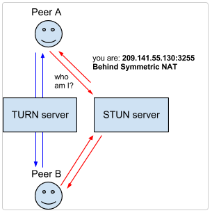NAT는 단말에 공개 IP 주소를 할당하기 위해 사용됩니다. 라우터는 공개 IP 주소를 갖고 있고 모든 단말들은 라우터에 연결되어 있으며, 비공개 IP 주소를 갖고 있습니다. 요청은 단말의 비공개 주소로부터 라우터의 공개 주소와 유일한 포트를 기반으로 번역될 것입니다. 이러한 경유로 각각의 단말이 유일한 공개 IP 없이 인터넷 상에서 검색될 수 있는 방법입니다. 어떠한 라우터들은 네트워크에 연결할 수 있는 제한을 가지고 있어서 STUN 서버에 의해 공개 IP 주소를 발견하더라도 모두가 연결을 할 수 있는 것은 아닙니다. 이를 위해 TURN이 필요합니다.