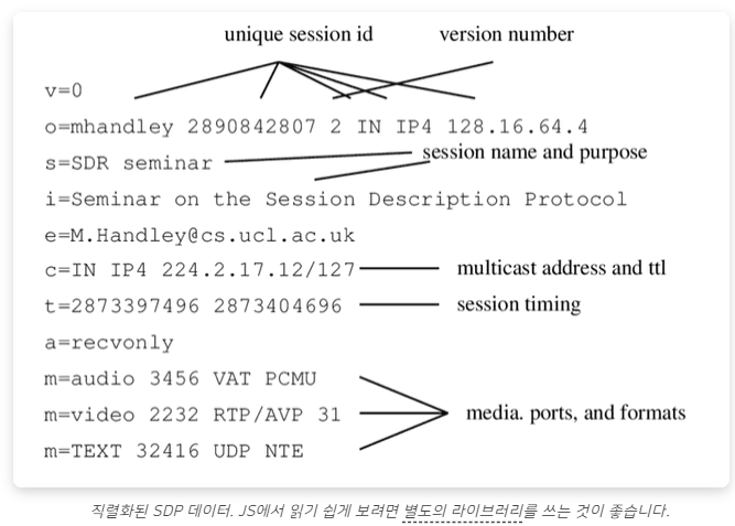 SDP는 해상도나 형식, 코덱, 암호화 등 멀티미디어 컨텐츠의 연결을 설명하기 위한 표준입니다. 이것은 두 개의 peer가 다른 한 쪽에서 데이터가 전송되고 있다는 것을 알게 해주며, 기본적으로 미디어 컨텐츠 자체가 아닌 컨텐츠에 대한 메타데이터 설명이 됩니다. 기술적으로 보면 SDP는 프로토콜이 아니지만, 데이터 포맷은 디바이스 간의 미디어를 공유하기 위한 연결을 설명하기 위해 사용됩니다.