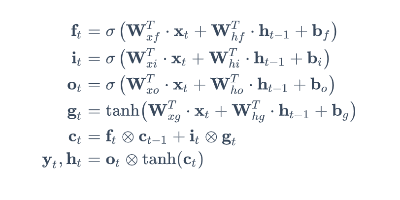 다음 식은 위의 그림의 타임스텝 t에서 셀의 장기 상태, 단기 상태, 그리고 각 레이어의 출력을 구하는 식을 나타낸 것입니다.