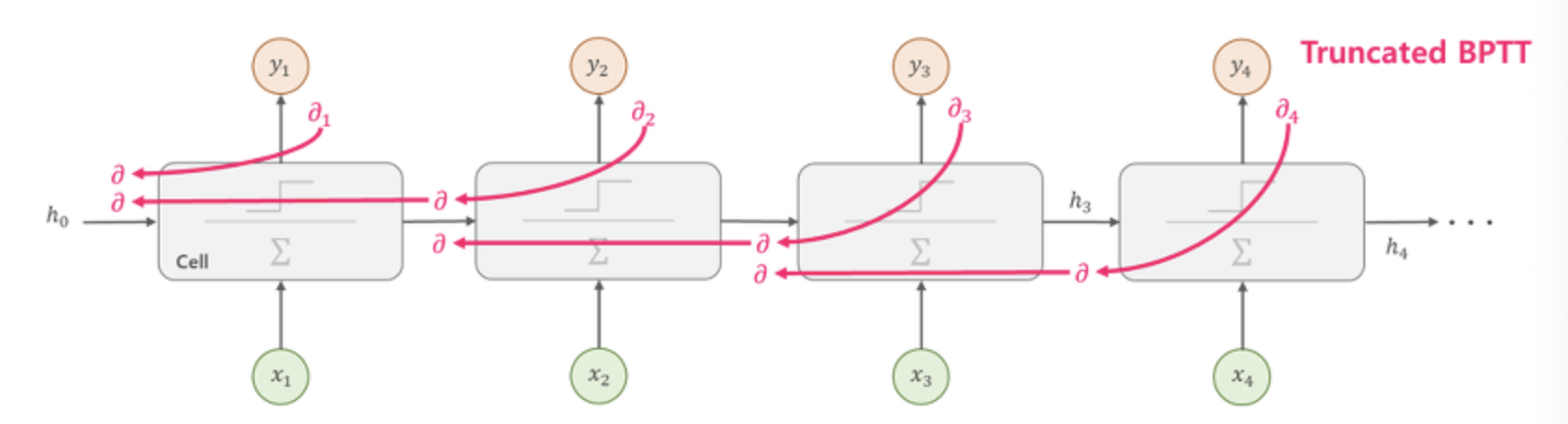 -아래 그림과 같이 타임 스텝을 일정 구간(일반적으로 5-steps)으로 나누어 역전파를 계산하여 전체 역전파로 근사시키는 방법입니다.
