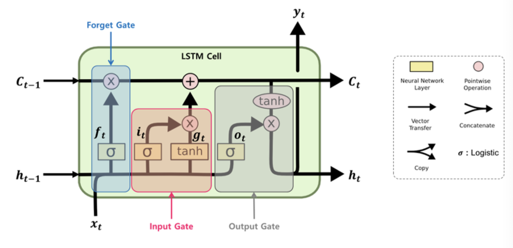 -$b_f, b_i, b_0, b_g$: 네 개의 레이어에 대한 편향(bias)으로, 텐서플로우에서는 $b_f$를 1로 초기화하여 학습 시작시에 모든 것을 잃어버리는 것을 방지합니다.