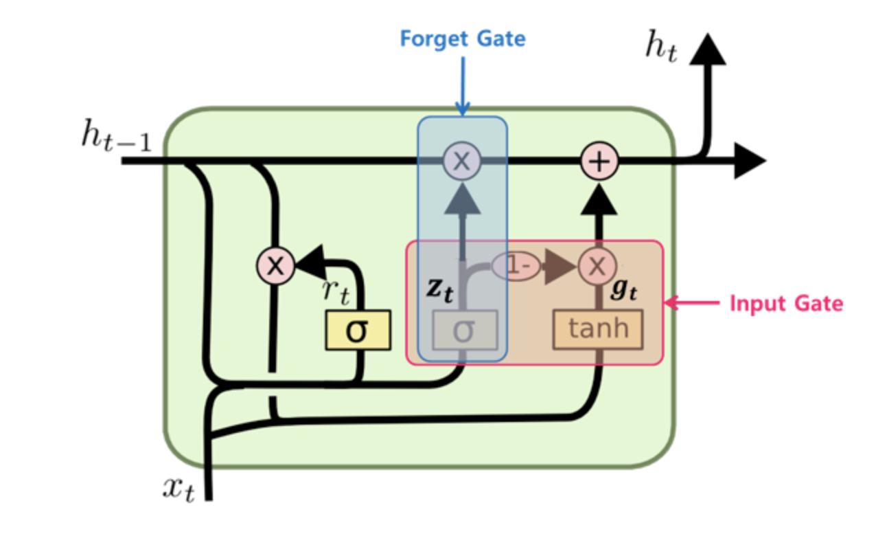 - 하나의 gate controller인 $z_t$가 forget과 input 게이트(gate)를 모두 제어합니다. $z_t$가 1을 출력하면 forget 게이트가 열리고 input 게이트가 닫히며, $z_t$가 0일 경우 반대로 forget 게이트가 닫히고 input 게이트가 열립니다. 즉, 이전(t-1)의 기억이 저장될 때마다 타임 스텝 t의 입력은 삭제됩니다.